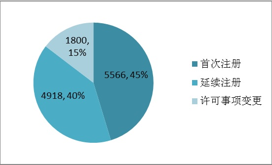 按注册形式区分,首次注册申请2402项,延续注册申请5105项,许可事项变更申请1889项。