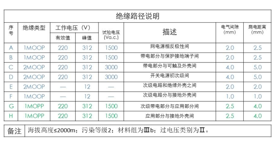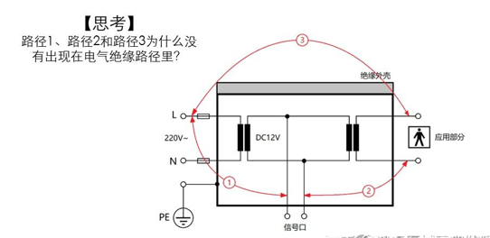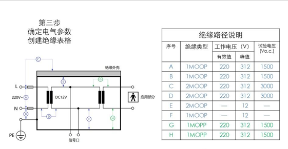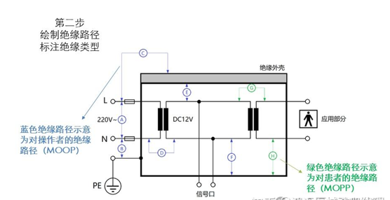 此类医用电气设备一般都包含8个最基本的绝缘路径:网电源相反极性之间(路径A),网电源带电部分与保护接地之间(路径B),网电源带电部分与未保护接地外壳之间(路径C),网电源开关电源初次级之间(路径D),次级电路与未保护接地外壳之间(路径E),次级电路与保护接地之间(路径F),次级电路与应用部分之间(路径G)和应用部分与保护接地之间(路径H)。这些基本路径又可分为对操作者的绝缘路径(MOOP)和对患者的绝缘路径(MOPP),建议用不同颜色或形状的线条来区分。