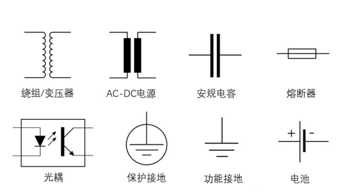 一幅完整的电气绝缘图一般包括:电源部分、保护接地部分、未保护接地外壳、中间电路、应用部分。每个部分有一些约定俗成的画法(如下图所示),记住这些基本图形,稍微练习几次就能掌握。