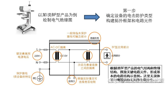 一般的绘制流程为:(1)确定ME设备的电击防护类型(I类,II类,内部电源);(2)构建拓扑框架和电路元件;(3)绘制绝缘路径;(4)标注绝缘类型;(5)确定电气安全参数;(6)创建绝缘参数表格;(7)审核与完善。为了更容易理解,请参考下图示例:
