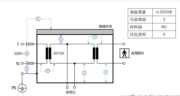 上图以I类设备为例,假设该产品为BF型应用部分,拥有信号输入/输出端口和未保护接地的可触及外壳。绝缘图中分别给出了网电源额定电压(220VAC),AC-DC电源输出电压(12VDC),以及次级电路与应用部分之间的隔离。与电气原理图不同,很多与操作者和患者绝缘无关的元器件没有必要体现(如继电器、控制电路板等)。之后就可以在此基础上绘制绝缘路径了。