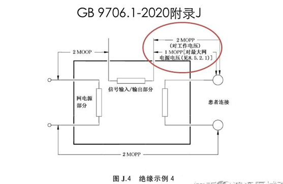 路径1:网电源带电部分与信号口之间;路径2:应用部分与信号口之间;路径3:网电源带电部分与应用部分之间。实际上,很多ME设备的电气绝缘图中确实给出了上述3条绝缘路径。在实际耐压测试过程中,路径1、2、3的试验电压实际上是被路径D和路径G的绝缘"承担"的,换句话说,只要路径D和G的测试没有问题,那么路径1、2、3也应该没有问题。但为什么在实际测试时,即使D和G已经通过测试,但路径1、2、3的试验依然有“失败”的情况?其实对于路径1和2来说,试验电压往往难以避开信号口附近分布的电压敏感器件,测试电压过高容易首先击毁这些敏感电路元件,但这些元器件并不是预期作为防护措施的绝缘,按照GB 9706.1-2020中8.8.1的规定“只有作为防护措施的绝缘,包括加强绝缘,才应做试验。”因此,只要路径D和G通过测试,那么路径1和路径2可不再进行试验。绝缘路径2源于GB9706.1-2020的附录J中图J.4绝缘示例4,需要特别注意的是,这个示例中路径2要求信号口与“患者连接”之间能承担对最大网电源电压1MOPP的绝缘要求,我们将这个部分的绝缘要求给到了路径G,因此只要路径G的测试满足要求,可以不用再测试路径2。